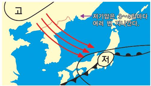 이동성 고기압이 빠져나가면 다시 찬 대륙고기압이 확장되는데 고기압의 생애가 7일 정도의 주기로 반복돼 삼한사온이라는 현상이 생긴 것입니다.