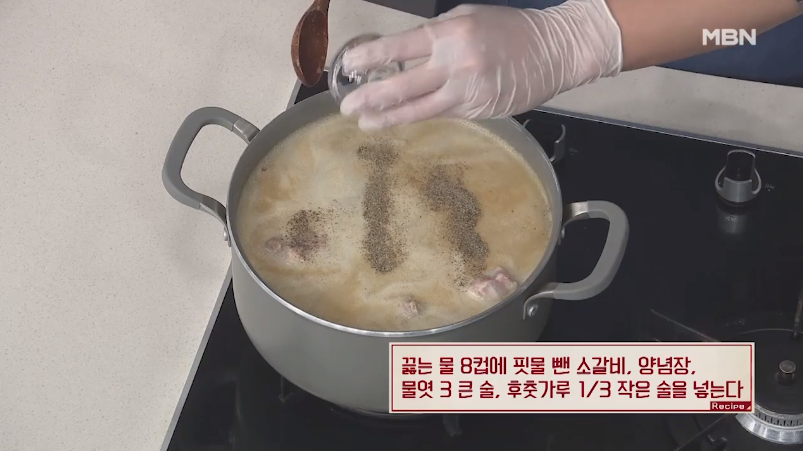 7. 끓는 물 8컵에 핏물 뺀 소갈비, 믹서로 갈아놓은 양념장, 물엿 3큰술, 후춧가루 1/3 작은 술을 넣어 주세요.