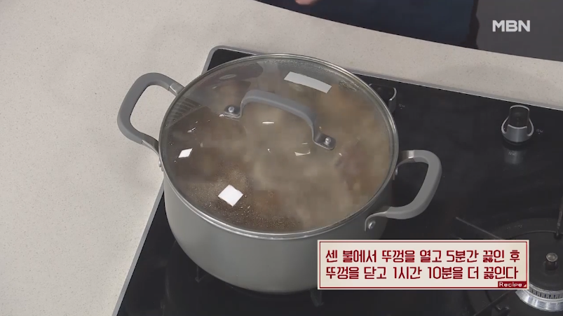 8. 센 불에서 뚜껑을 열고 5분간 끓인 후 뚜껑을 닫고 1시간 10분 더 끓여 줍니다.
