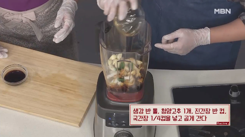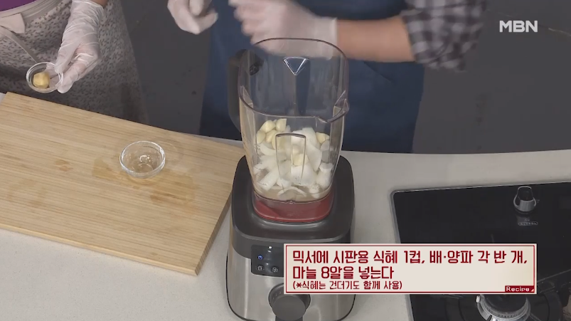 6. 이제 소갈비찜 황금레시피 양념 맛있게 만드는 법을 본격적으로 시작할게요. 믹서에 시판용 식혜 1컵, 배와 양파 각 반개, 마늘 8알, 생강 반톨, 청양고추 1개, 진간장 반 컵, 국간장 1/4컵을 넣고 곱게 갈아 주세요.