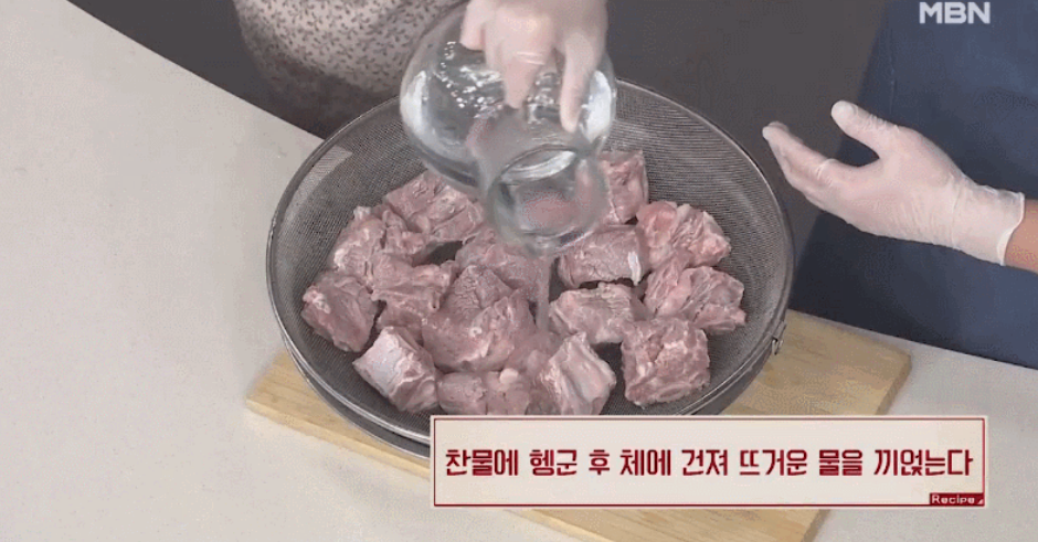 5. 찬물에 헹군 후 체에 건져 뜨거운 물을 끼얹어 주세요. 소갈비찜 황금레시피 비법 중 하나인데요, 소갈비에 뜨거운 물을 부으면 불순물이 제거되기 때문이예요.