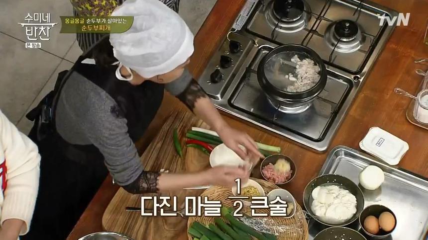 3. 간 돼지고기는 크게 한 큰술 넣고 양파는 5분의 1개만 썰어주세요. 오늘 순두부찌개 황금레시피 맛있게 끓이는법의 포인트는 양파를 채 썰지 않고 다지듯 썰어준다는 것!