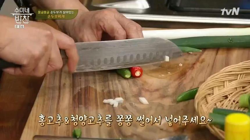 11. 마지막으로 홍고추와 청양고추를 쫑쫑 썰어 넣고, 대파, 계란을 넣어 센 불에 와르르 끓여주면 순두부찌개 황금레시피 맛있게 끓이는법이 완성됩니다.