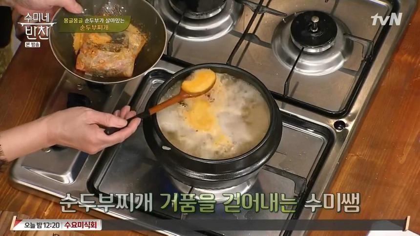 8. 순두부찌개는 구수하면서 칼칼한 맛이 포인트이기 때문에 거품은 걷어내주시구요, 후춧가루는 살짝 두 번 정도만 탈탈 털어주세요.