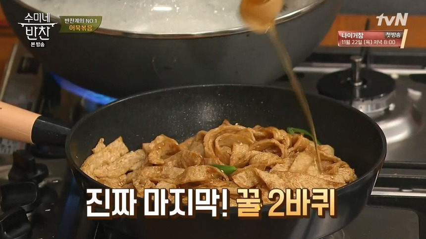 7. 마지막으로 통깨를 조금 뿌려주고, 아이들 있는 집에서는 약간 달게 꿀을 넣어주셔도 됩니다. 꿀 두 바퀴 휙 둘려주면 어묵볶음 맛있게 만드는법 황금레시피가 완성됩니다.