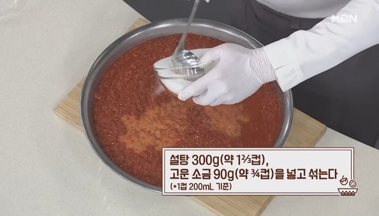 7. 이제 설탕 300g과 고운 소금 90g을 함께 넣어 줍니다.