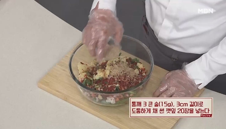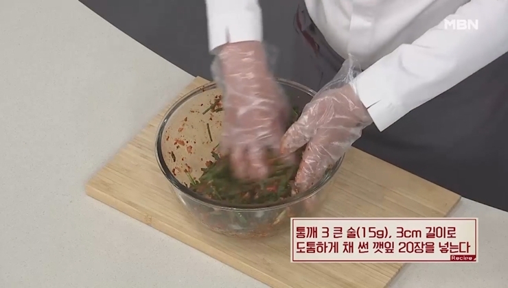 9. 통깨 3큰술을 넣고 향이 좋은 깻잎을 넣어 주어야 하는데요, 오늘 알려드리는 오이소박이 맛있게 담그는법의 비밀 재료라고도 볼 수 있어요. 깻잎 20장을 3cm 길이로 도톰하게 채 썰어 넣어 주세요.