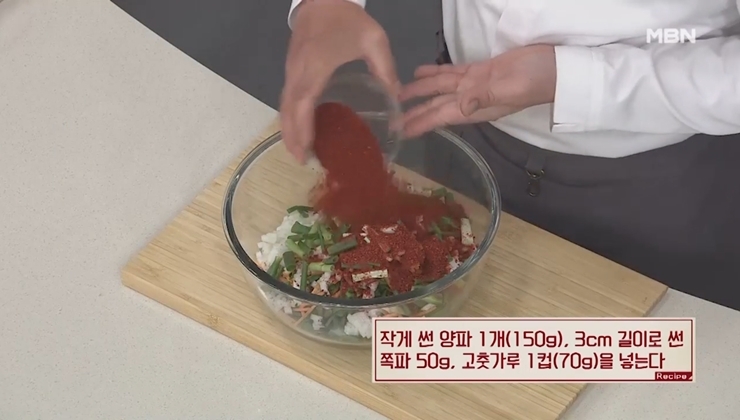 김칫소 : 3cm 길이로 썬 부추 250g, 3cm 길이로 채 썬 당근 30g, 작게 썬 양파 1개, 3cm길이로 썬 쪽파 50g, 고춧가루 1컵(70g), 까나리액젓 80g, 다진 마늘 7큰술(100g), 설탕 2큰술 (20g), 조청 2큰술 반(50g), 물 120ml(약 반 컵), 통깨 3큰술, 깻잎 20장