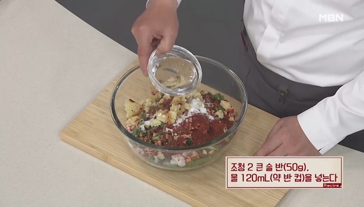 8. 조청 2큰술 반(50g)과 양념이 잘 섞이도록 물 120ml(약 반 컵)을 넣어 주세요.