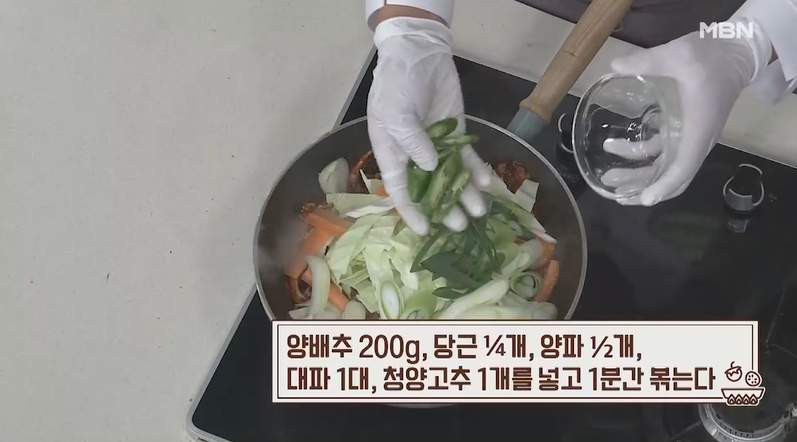 7. 부재료도 빠질 수 없겟죠? 양배추 200g, 당근 1/4개, 양파 1/2개, 대파 1대, 청양고추 1개를 넣고 1분간 더 볶아 줍니다.