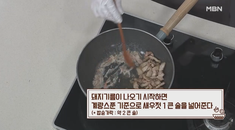 3. 돼지기름이 충분히 나왔다 싶으면 새우젓 2큰술을 넣어 주세요.
