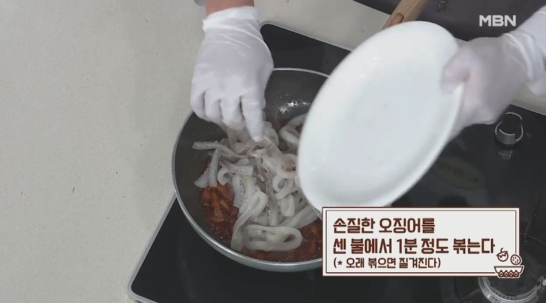 6. 손질해 둔 오징어를 센 불에서 1분 정도 볶아 주시구요.