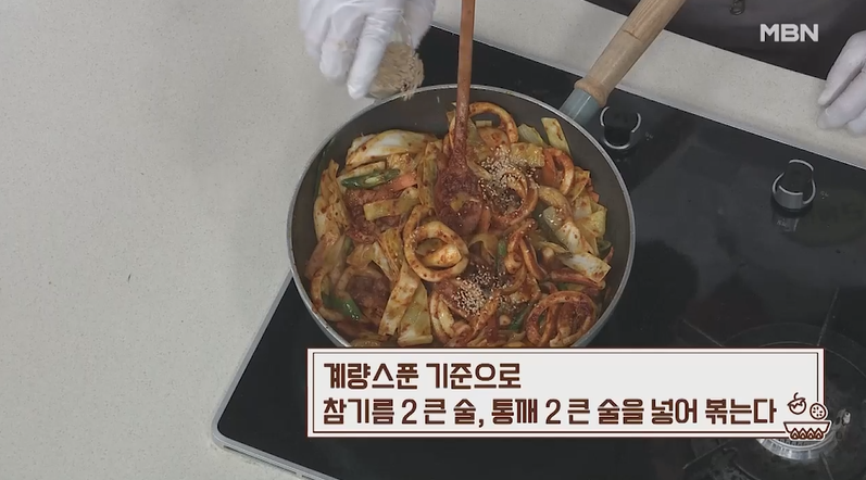 8. 마지막으로 참기름 4큰술, 통깨 2큰술 넣고 볶으면 오징어 볶음 맛있게 만드는법 양념장 황금레시피가 완성됩니다.