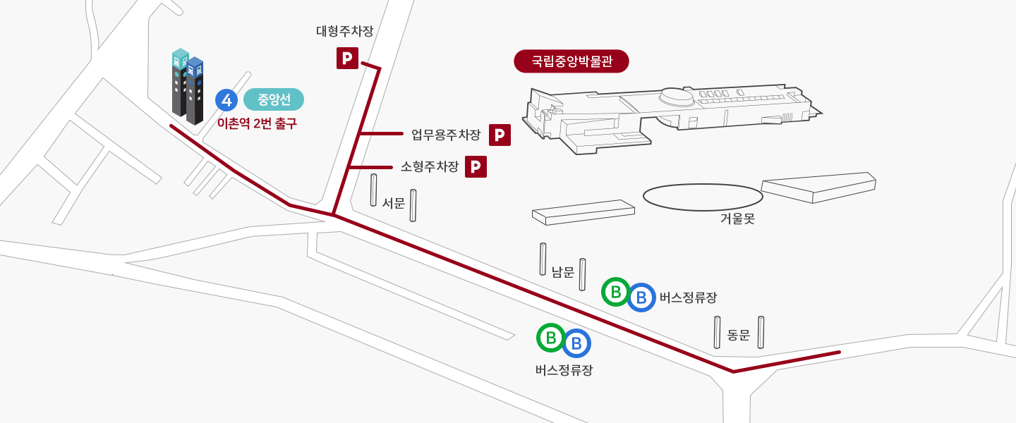 ● 신용산역 1번 출구 인근에 위치한 주출입구 또는 국립중앙박물관 북측 담장과 연결되는 부출입구를 통해 입장할 수 있습니다.