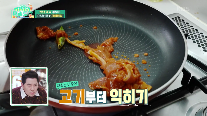 8. 불을 켜고 팬을 올린 뒤 제육볶음의 고기 먼저 올리는데 여기서 제육볶음 맛있게 만드는법 황금레시피 포인트! 고기에 거뭇거뭇한 부분이 생길 수 있도록 뒤적거리지 말고 기다려야 한다는 것이예요. 거뭇거뭇한 부위는 연탄구이처럼 감칠맛을 더해주는 효과가 있답니다.