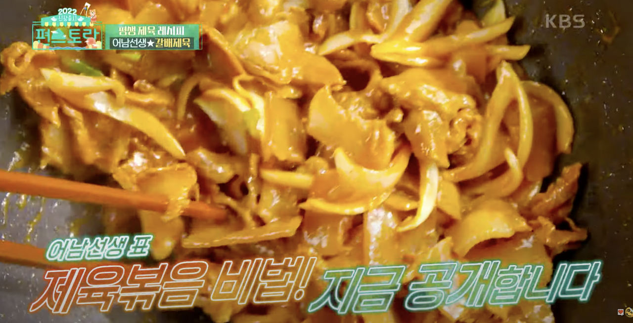 10. 마지막으로 으깬 마늘 한 숟갈을 넣고, 후추를 뿌려준 뒤 그릇에 플레이팅 하면 편스토랑 류수영의 제육볶음 맛있게 만드는법 황금레시피가 완성됩니다.
