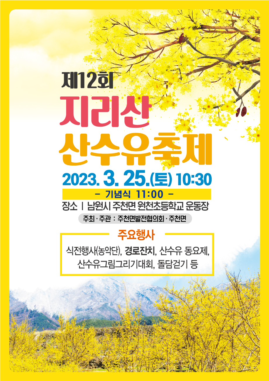 지리산 산수유 축제 2023 총정리를 안내해 드리도록 하겠습니다. 산수유 꽃이 만개한 남원 주천면 원천초등학교에서 3월 25일, 제12회 산수유꽃 축제가 열립니다.