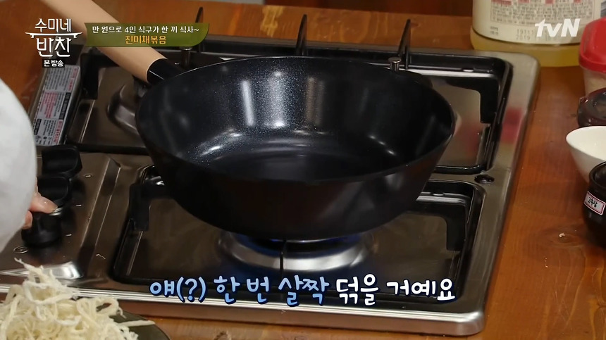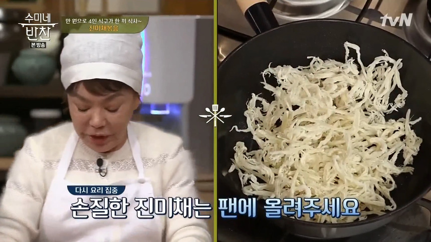 2. 손질한 진미채는 팬에 올리고 비린내 제거를 위해 기름없이 팬에 덖어줍니다. 팬에 덖을 때 분무기를 이용해 물을 뿌리면 진미채에 골고루 수분이 스며들어 더욱 촉촉해지기 때문에 오늘 진미채볶음 황금레시피에서는 분무기를 사용합니다.
