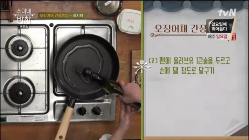 2. 팬에 올리브유 1큰술을 두르고 손에 댈 정도로 달궈주세요. 맨손으로 기름을 만져도 될 정도 열이 올라올 때 오징어 실채를 넣고 기름이 골고루 흡수될 수 있도록 살살 뒤집어줍니다.조리 시 꼭 약한 불로 해주는 것 잊지마세요.