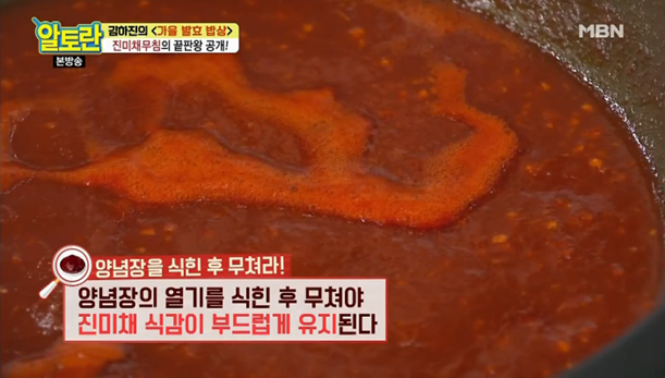 6. 양념장을 완전히 식혀주어야 하는데요, 진미채에 열을 가하면 수축한 채로 식어서 딱딱해지기 때문이라고 해요. (진미채볶음 황금레시피 부드럽게 하는 방법)