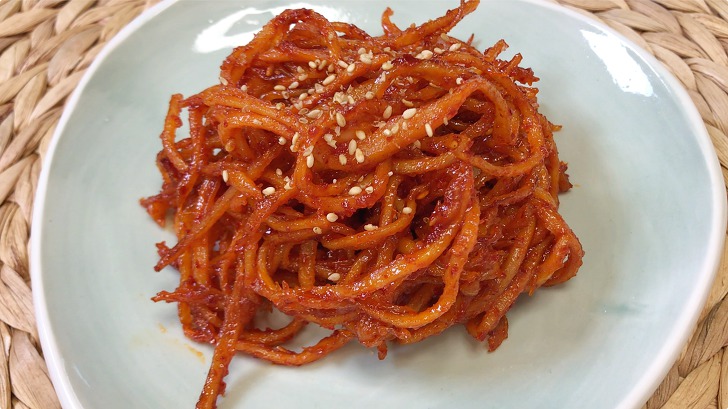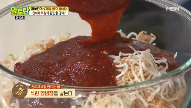 재료 : 진미채 400g, 가늘게 썰어 말린 무말랭이 200g, 고추장1컵, 쌀조청 1컵, 고운 고춧가루 7큰술, 맛술5큰술(또는 소주), 다진마늘5큰술, 생강즙 1큰술, 양파즙, 배즙, 사과즙 각 반컵, 송송 썬 실파 70g, 참기름 3큰술, 검정깨(또는 통깨) 3큰술