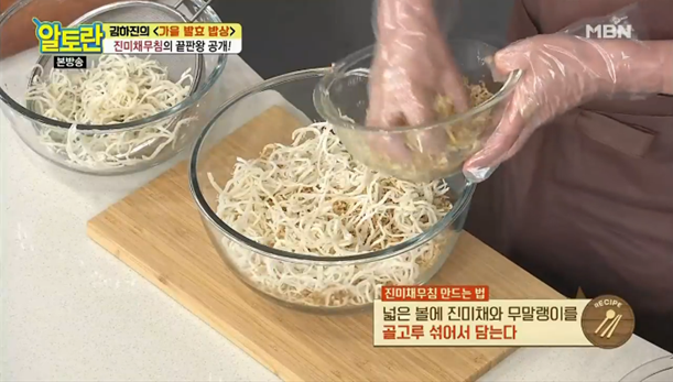 7. 넓찍한 볼에 진미채와 무말랭이를 골고루 섞어서 담아 주세요.