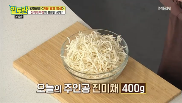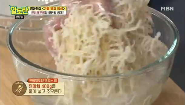 1. 먼저 진미채 400g을 물에 넣고 주무러준 후 물기를 제거해주어야 하는데요, 이렇게 하면 짠맛이 빠질뿐 아니라 식감이 더 부드러워진다고 해요. (진미채볶음 황금레시피 비법1)