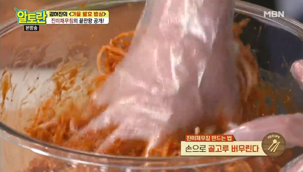 8. 식힌 양념장을 넣고 손으로 골고루 버무려 주세요.