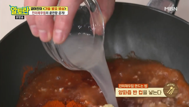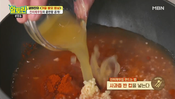 5. 맛술 5큰술, 다진마늘 5큰술, 생강즙 1큰술, 양파즙 반컵, 배즙 반컵, 사과즙 반컵을 넣고 잘섞어주세요. 이 상태로 중불로 5분간 끓입니다. 이렇게 해야 텁텁함 없이 깔끔한 맛이 난다고 하네요. (진미채볶음 황금레시피 비법2)