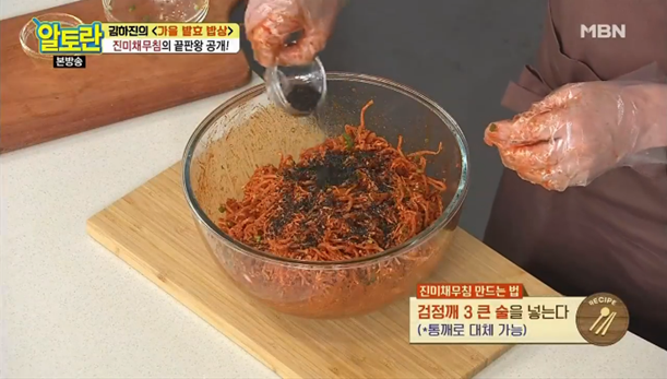 9. 마지막으로 송송 썬 실파 70g, 참기름 3큰술을 넣고 검정깨 3큰술을 넣으면 진미채볶음 황금레시피 부드럽게 하는 방법이 완성됩니다.