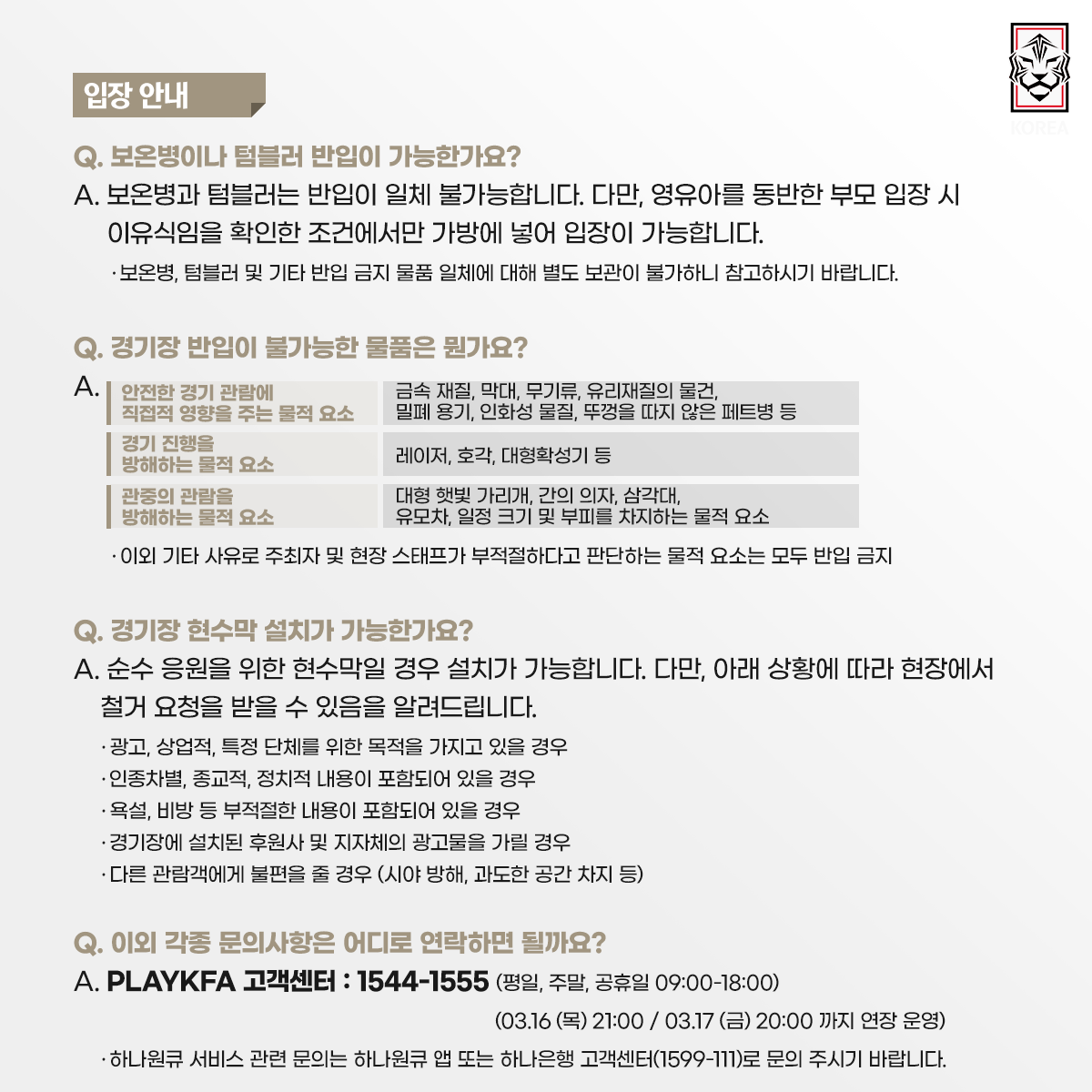 입장권은 대한축구협회의 온라인 판매 사이트 플레이KFA를 통해 판매되며 일부 수량은 하나은행의 모바일 앱 '하나원큐'에서도 구입할 수 있습니다. 1인당 최대 4매까지 살 수 있어요.