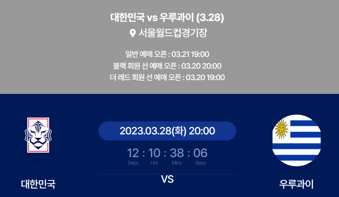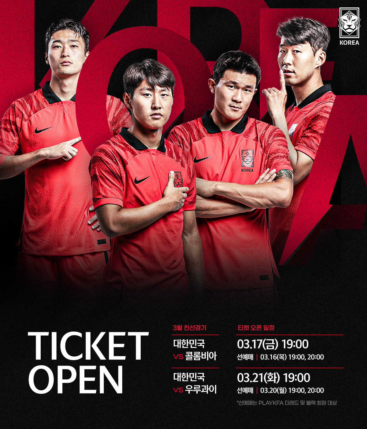 우루과이전 입장권도 20일에 플레이KFA 회원에게 선예매 기회가 주어집니다. 콜롬비아전과 마찬가지로 ‘Red’ 회원은 오후 7시부터, ‘Black’ 회원은 오후 8시부터 구매할 수 있으며 일반 판매는 21일 오후 7시부터 시작됩니다.