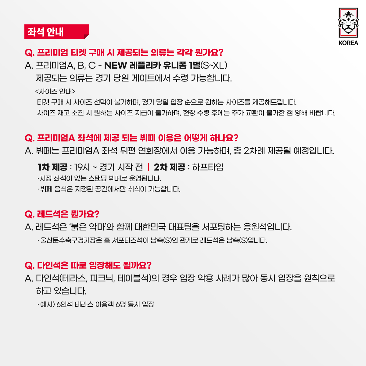 프리미엄석은 대표팀 레플리카가 선물로 제공되며 A, B, C로 구분됩니다. 각각 25만원, 20만원, 15만원에 판매되구요, 프리미엄 A석은 뷔페까지 제공됩니다.