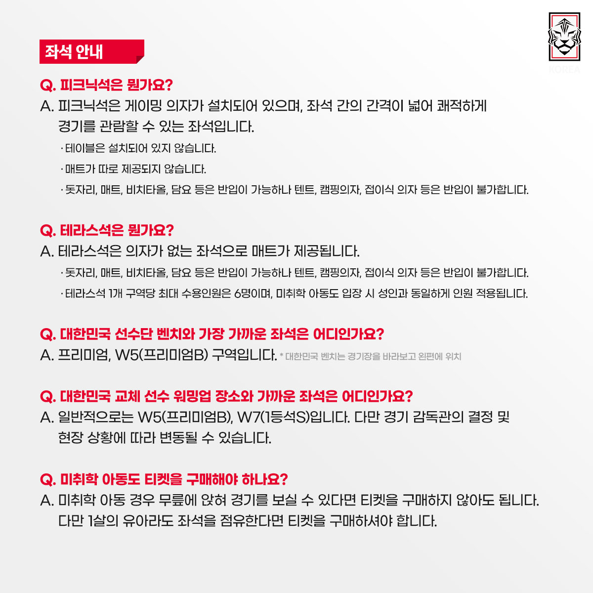 주류와 안주가 제공되는 스카이펍은 25만원이고 성인만 구매할 수 있으며 스카이박스는 플레이KFA에서 확인 후 구입할 수 있습니다. 프리미엄석은 대표팀 레플리카와 뷔페가 제공되며 30만원에 판매됩니다.