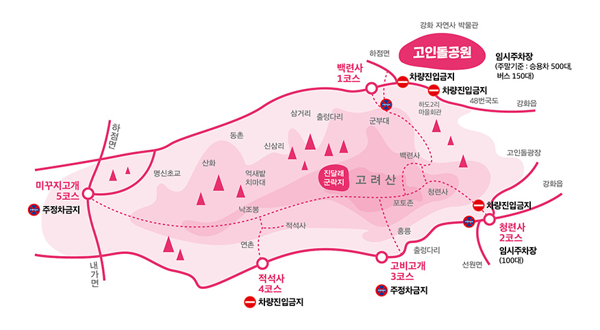 ● 2코스(청련사 방향, 주차가능) : 강화읍 고비고개로 188 (강화읍 국화리 599-2)